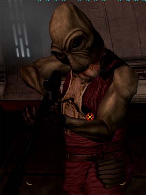 到着です。(チュートリアルの開始ってことです) 親父の頭に隠れてますが、帝国軍将校が呼んでます。 親父の頭にあるグリーンのマークは入れ墨ではありません。 将校に何か言われた後、付いて来いってことで追いました。 親父の腰の所に注目です。この段階では気付いていませんでしたし、その後も気付かなかったのですがSSを編集してて判りました。(後述) |