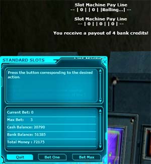 で、くどいようですが、大規模Patch後にスロットマシンとルーレットが導入されたです。 ホテルに置いてあると言うことなのでギャンブル好きな親父は速攻で行ってみました。 RPGと言えば、国産民生機用のRPGですらギャンブル場は当たり前ですし、享楽のためには必需品でしょう。 しか〜し、、これがスロットです。 1BET〜最大3BETって3creditじゃん、、で、試しに1Crで回してみました。 親父は探しましたよ、スロットのリールを、、どんな柄が出るのかつうのが楽しみなスロットなのに、、、画面上にキャラクタが出るだけっす。 回転もしてないし、、 それでも都合、20分以上は遊んだでしょうか。揃うのは最低の当たりの「000」だけでした。 それでも300crほど儲かったようですが二度とやらないと心に誓いました(w |