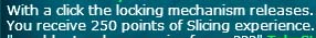 Laser Knifeが1個減ったけど、成功したです。 画面、見ずらいけど。 で、250PointゲットですがSliceの1段階目は5000Exp必要なので後、24個のLocked Containerを開けないと駄目なんです。 |