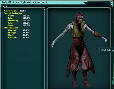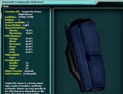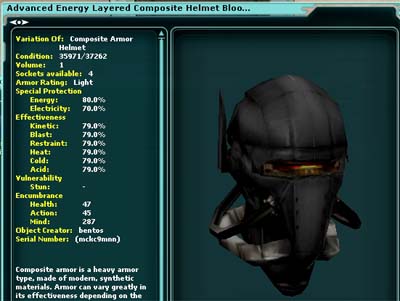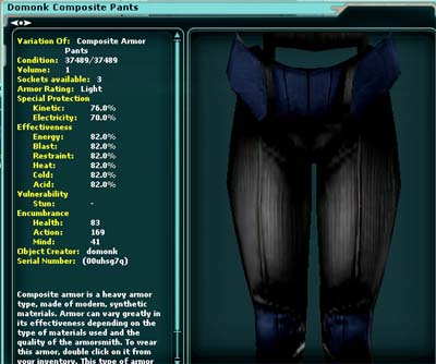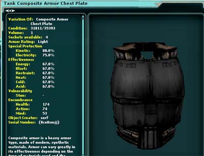 これはArmaniさん作の一品です。 以前は120,000Credで売っていたとか言う物ですが親父が買いに行った時には売れなくて80,000Credまで下がってましたので速攻で買ったです(w これもDomonkさんのを越えてるのでこちらを使うわけです。 この2点、色が違うでしょ、でも、おkなんです。 SWGシステム作成者側のミスでCompositeArmorの色が再現出来ないってバグがあって、2週間の期間限定ですが自分の好きな色に変更できるのですよ(w |