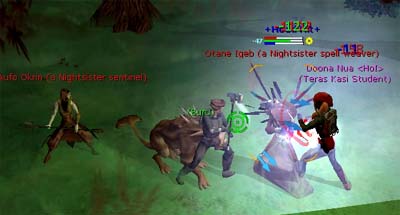 この青白い光がFORCEです。痛いです。 Docが居ると言うことでFullBuffにして貰ってますが、攻撃が激しくStimの使いまくりでMindがどんどん減ります。 Smugglerの作る麻薬にMuon Goldってのがあって10分間だけMind系を倍ほどパワーアップしてくれるのがあるです。 しかし、麻薬ですので切れると3分間はMind系はほぼ無くなってしまうのです で、この戦いの最中に麻薬効果が切れてしまって親父はClone送りになったです この姉ちゃん達にBikeを8割ほど壊されていたので帰りの心配はしないで済んで良かったですが(バキ |