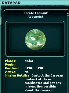 今回のクエストは他の星に行くことが前提になってるので吹き出し文字にはめ込み出来ずにログ画面に目標位置が表示されてるって手抜きモードになってるようです 心配だったのでDataPadを見てみるとちゃんと入ってました |