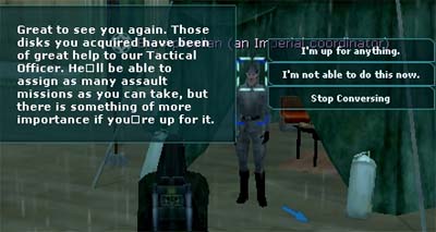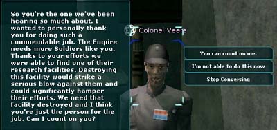 話の出だしでこの返答を選ぶのですがここが他のクエストとちょっとだけ違ってるわけです 2番目の「I work for Jabba」と答えないとならんのですよ この件は帝国の将校との話の中で出てくるので英語をきちんと理解してれば無問題ですがいつものパターンで一番上を選ぶと戦いになるです |