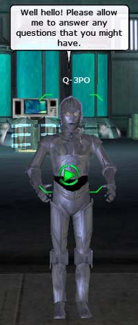 次は、C3-POじゃなく、Q-3POのお出迎えです。(金色じゃないし) ここではクローニングとInsuranceのお勉強です。 SWGではほとんど死ぬことが無いそうです。気絶状態になってその状態でDeath-Blowされると死ぬらしいです。(親父は気絶しか経験してないです) で、死んだ場合でも蘇れるようにクローニングしておくわけです。 また、死んだら持ってたアイテムも無くなる可能性があるので貴重なアイテムには保険を掛けておくわけです。 で、そのお勉強をするです。 |