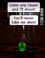 到着です。(チュートリアルの開始ってことです) 親父の頭に隠れてますが、帝国軍将校が呼んでます。 親父の頭にあるグリーンのマークは入れ墨ではありません。 将校に何か言われた後、付いて来いってことで追いました。 親父の腰の所に注目です。この段階では気付いていませんでしたし、その後も気付かなかったのですがSSを編集してて判りました。(後述) |