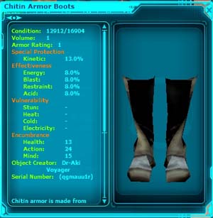 翌日、気を取り直してログインしますと何もなかったかのようにChitinのBootを履いていました。 実際の効果もあるようですし、弱いCreatureで気絶もしなくなりました。 |