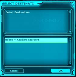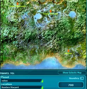 Novice Riflemanになったので最上位の武器であるT-21を買い出しに行くです。 折角の買い物ですから、最上位なら現代の名工と言われる人のを持ってみたいってのが人情ですから、米国の公式サイトで書かれていたCorbantis最高の武器職人であるFate氏のベンダーを訪問することにしました。 これが始めての星間旅行です。 いつも使ってるShuttlePortではなく、StarPortから行くことになります。 下段の「Planet」がタブになっているので目的地の「Naboo」を選択すると地図がNabooのものになりますので「Kaadera」を選びます。 |