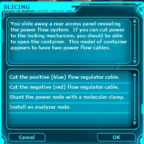 Locked Containerをクリックした時に出るメニューから「Slice」を選ぶとこんな画面が出てきます。 青切るか赤切るかだけが選べます。 下のclampやanalyzer nodeはSmuggler屋で売ってるようですが、正解率が100%になるわけじゃないそうなのでパスです。 |