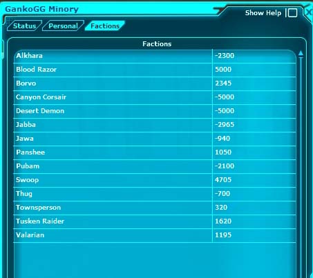 しかし、街から少しでも離れると不味いことが起こります。 これはFACTIONがどうなってるかの値なのですが、、、 人型mobのうち、Caryon CorsairとDesert Demonが「−5000」です。 こいつら、毎回襲ってくるので殺ったり殺られたりを繰り返していたら、こんなんになっちゃいました。 なので、見つかると親父の側にPCが居ても必ず、親父を攻撃してくるです。 いくら、殺しても-5000を越えないのでMAXなようです。 Tatooineではお尋ね者なので、必ず「おさる」を護衛につけてないと危ないです。 |