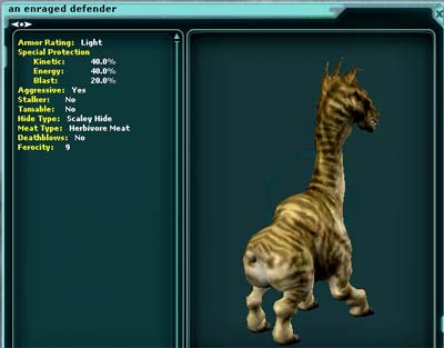 ソーズマンを極めるため、現住所のDantooineでPiketってのを狩ります 左のキリンみたいなのですが、これがかなり楽です Dantooineのmobは凶悪なのが多くてダメージ以外に毒やシビレ等、副次効果をもたらすのですがこいつはREDな1種類を除いてたいしたことありません ♀に特徴があって、巣を或いは子供を攻撃しない限り一家の♂を攻撃しても何もしてきません。それにEXPが平均で4000とウマーなのです。 ソロメインの親父ですが、時間あたり10万Expを稼げるので短期間でMasterになれるわけです。 SSのこのPiketはレアなBossでしたので記念撮影しました |