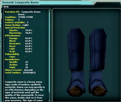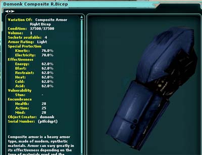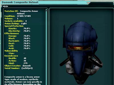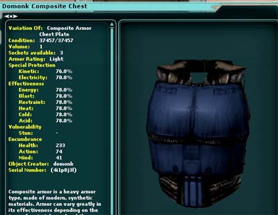 これはArmaniさん作の一品です。 以前は120,000Credで売っていたとか言う物ですが親父が買いに行った時には売れなくて80,000Credまで下がってましたので速攻で買ったです(w これもDomonkさんのを越えてるのでこちらを使うわけです。 この2点、色が違うでしょ、でも、おkなんです。 SWGシステム作成者側のミスでCompositeArmorの色が再現出来ないってバグがあって、2週間の期間限定ですが自分の好きな色に変更できるのですよ(w |