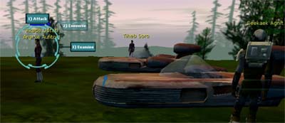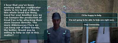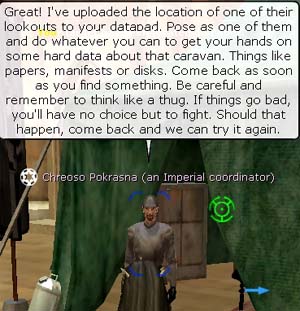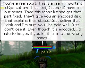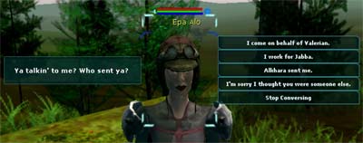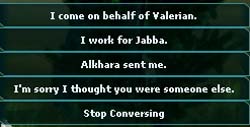 話の出だしでこの返答を選ぶのですがここが他のクエストとちょっとだけ違ってるわけです 2番目の「I work for Jabba」と答えないとならんのですよ この件は帝国の将校との話の中で出てくるので英語をきちんと理解してれば無問題ですがいつものパターンで一番上を選ぶと戦いになるです |