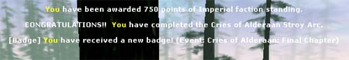 アルデラーンの嘆き第3部、だそうで、親父は1も2もやってませんでしたが Act1,2は全サーバーで反乱軍の勝利だったそうなので少しは貢献しようかとやってみたです JPNの情報によりNaboo Theed(-5430 4164)にいるImperial coodinatorに話を伺ったです 何度か話すると今度はInformation Officerを話しろと言われます |