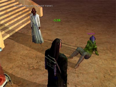 1Acc目が戦闘職ですと2Acc目を育てるのってのはかなり簡単ですな Combat ExpはCapの300,000ありますし、資金も相当あるはずです このゲーム何が辛いかって一番辛いのはAppExp(教えた経験値)です まずはこれを制覇しておきます NoviceMarksmanを取らせて、拳銃を持たせTatooineのMosEspaへ 街の出入り口付近にLinkしない低級なMobがいるのでCombatExpが300になるまで戦わせRanged Weapon Supportの第一段階目を取らせます で、1Acc目にRanged Weapon Support Iを教え、1Acc目は教わったら削除を繰り返してAppExpのCap1280pointになるまで教え続ければいいわけです (この時点ではAppExpは620でしたが現在では1Masterで300になってます) カエルの目的はGankoGG専用Buff屋ですので次はMaster Medic、その後、Master Docterにすることです 医療系SkillはCraftingExpと自分以外をHealして稼ぐMedicalExpです CraftingのExpに必要な分の資材を購入してPowerCraftは1Accで容易くできます 問題はHealですが、1Acc目にRanged Weapon Support IIを覚えさせてTumble To StandingのAbilityを使います 跪くて立ち上がるを繰り返す技ですがこれを使うとActionが減ります MacroでTumble To Standingを繰り返しやらせActionが減ったらStimを使って回復させます これでMedicalExpを稼ぎます 簡単に上がって行くのでDoctor Trainerの側でやると楽です |