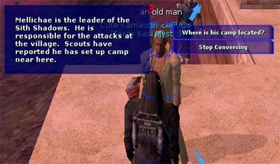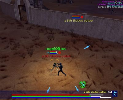 1番初めのクエストはなんとDathomirでした それもJEDI村で受けるってことです 丁度、Phase4真っ最中でSithが攻めてきてるわけで・・・ 行くのどうしようか悩んだんですが、、3週間待つなんて出来るわけじゃなし 行ってみると案の定、Sithが居ましたが数が少ない これ、90分の襲撃の最後みたいです 村に入ろうとすると2匹がLink、、親父、気負い立ってますから殺っちゃいます |