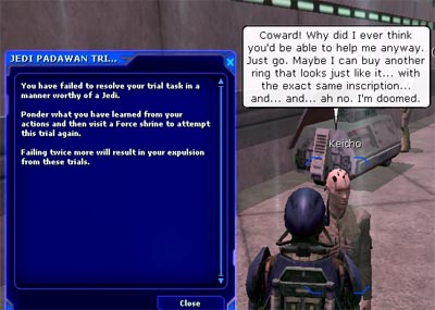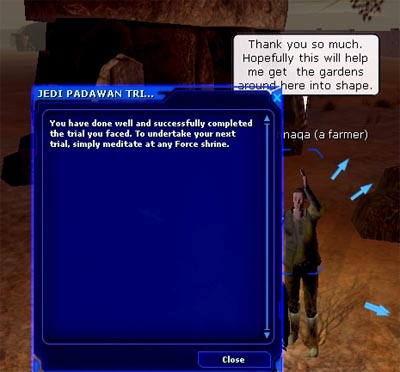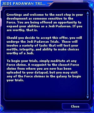 このPadawan Trial、全部で16のクエストがあります 同じクエストを3回失敗すると初めからやり直しだそうです ほとんどが簡単なお使いクエストです 戦闘があるのは6つほど 中に何々を20匹倒せってのがあってターゲットを探すのが面倒なクエストが3つあります |