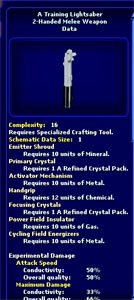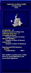 Lightsaberが増えてます 材料の品質は関係ないのでサクと作成するとShrineへ来いと言われます その後、親父の場合は7つのクエストをやったですよ ミスが1回、バグが1回、ツイてたようで都合2日で終了しました 一番大変なのはShrineでクエスト貰って別の惑星に行って完了させて、また、Shrineへ行ってと、この道のりの長さでしょうか |